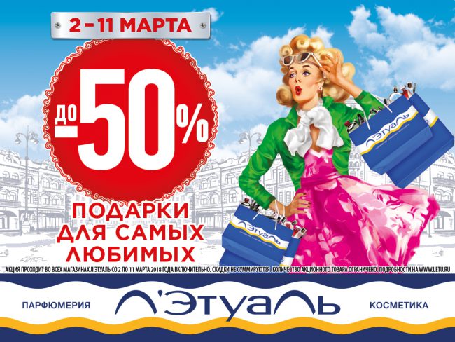 Срок проведения акции: 2 марта — 11 марта 2018 г. Место проведения: -магазины сети Л’Этуаль; -интернет-универмаг www.letu.ru и мобильное приложение Л’Этуаль с доставкой во все города присутствия магазинов сети Л’Этуаль. Скидки до 50% на товары, участвующие в акции! Действие акции не распространяется на покупку подарочных сертификатов. Скидка по акции не суммируется с другими скидками. Подарочные сертификаты…