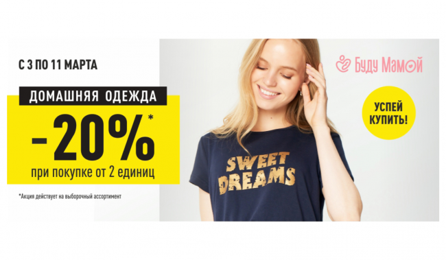 Скидка -20% на домашнюю одежду в «Буду Мамой» только с 3 по 11 марта!