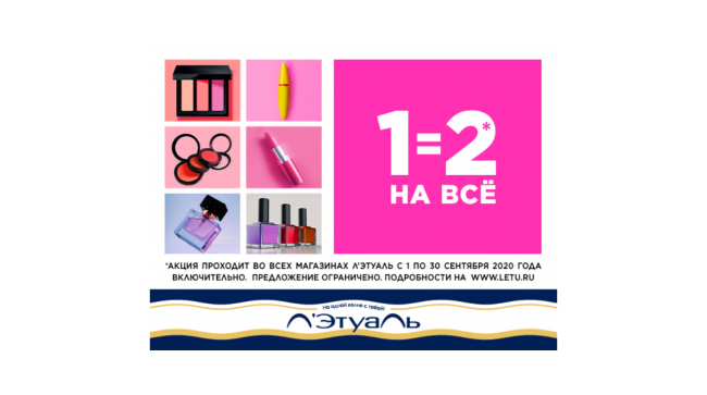 Срок проведения акции: 1–30 сентября 2020 г. Место проведения: -интернет-магазин www.letu.ru и мобильное приложение Л’Этуаль с доставкой во все города присутствия магазинов сети Л’Этуаль. -магазины сети Л’Этуаль. При покупке одного товара второй* вы получаете в подарок! Правила и список товаров, участвующих в акции, размещены на сайте www.letu.ru * одинаковый по стоимости или с более низкой…