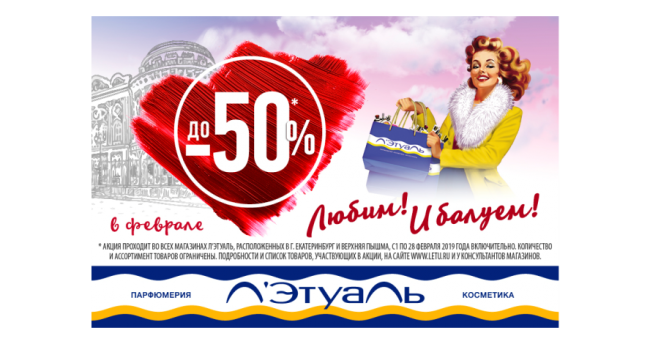 Срок проведения акции: 1–28 февраля 2019 г. Место проведения: -магазины сети Л’Этуаль, расположенные в гг. Екатеринбург, Верхняя Пышма; -интернет-магазин www.letu.ru и мобильное приложение Л’Этуаль с доставкой по гг. Екатеринбург, Верхняя Пышма. Скидки до 50% на товары, участвующие в акции! Действие акции не распространяется на покупку подарочных сертификатов. Скидка по акции не суммируется с другими скидками.…