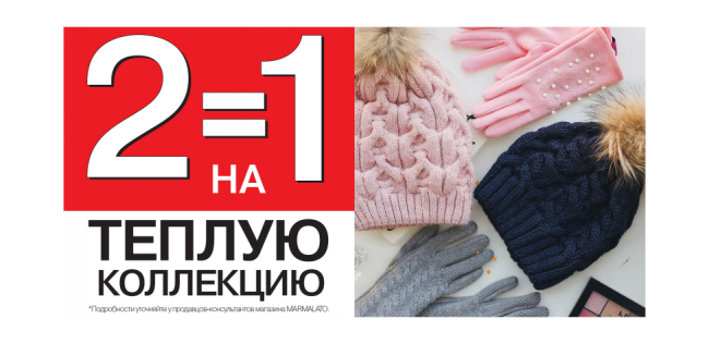 Распродажа в MARMALATO продолжается! Тысячи аксессуаров со скидками до 70% и специальное предложение на теплые аксессуары из распродажи – два аксессуара по цене одного! Шапки, рукавицы, снуды, шарфы и перчатки — выбирай свой теплый комплект! Ты можешь выбрать классный снуд из теплой коллекции по цене распродажи  и подобрать к нему новую шапку, которую ты получишь совершенно БЕСПЛАТНО!…