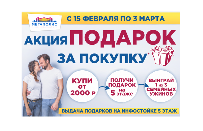 С 15 февраля по 3 марта покупайте подарки любимым, получайте гарантированный подарок и возможность выиграть один из 3х сертификатов на Семейный ужин в ТРЦ Мегаполис на 5 000 руб. Совершите покупку в магазинах ТРЦ Мегаполис на сумму от 2000 рублей. Получите гарантированный подарок на информационной стойке (5 этаж). Вы можете получить больший подарок при покупке на…