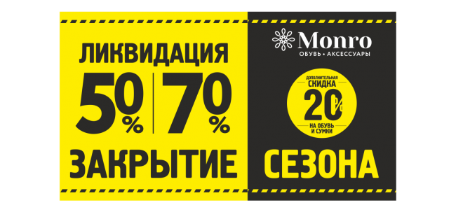 Ликвидация! Закрытие сезона. Убойный SALE на всё: 50-70%. В магазинах обуви МОНРО закрытие сезона. Мы ликвидируем зимнюю коллекцию и дарим убойные скидки 50% — 70%. Но и это ещё не предел для экономии! Дополнительно в МОНРО можно получить скидку 20% на всю трендовую обувь новой коллекции с белыми ценниками. Спешите в МОНРО, ведь в любую…