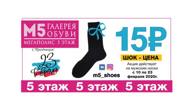 С 10 по 23 февраля 2020 года, «Галерея Обуви М5» запускает акцию «Мужские носки по 15 рублей».   Магазины участвующие в акции: «Европейский» — бутик Б-506; «ShoesBeri» — бутик Б-507; «БотинкинЪ» — бутик Б-510; «M’shoes» — бутик Б-512; «TREND shoes & bags» — бутик Б-513; «Sasha Fabiani» — бутик Б-514; «Stivali» — бутик Б-515; «Мир Детской Обуви» —…