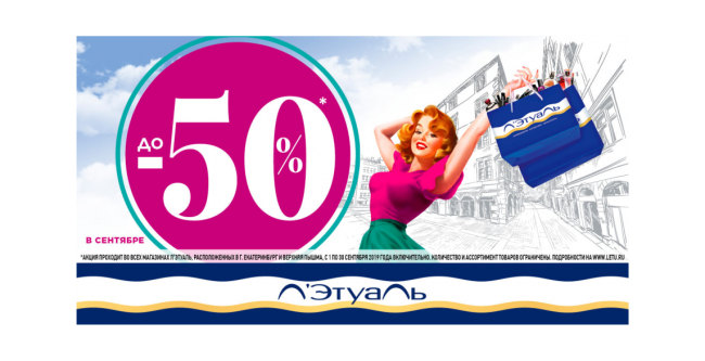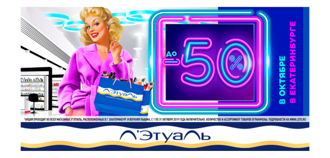 До -50% в октябре! Срок проведения акции: 1–31 октября 2019 г. Место проведения: -магазины сети Л’Этуаль, расположенные в гг. Екатеринбург, Верхняя Пышма; -интернет-магазин www.letu.ru и мобильное приложение Л’Этуаль  с доставкой в гг. Екатеринбург, Верхняя Пышма. Специальные цены на товары, участвующие в акции! Скидка по акции не суммируется с другими скидками и предложениями. Сертификаты eCARDS и…