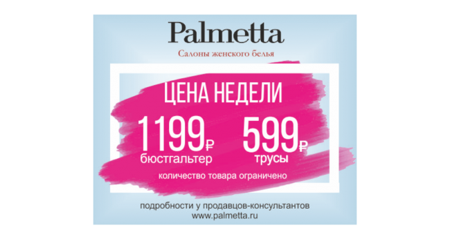 Предложение от салона женского белья Palmetta, перед которым невозможно устоять! Только с 26 ноября по 9 декабря действуют специальные цены на покупку белья! Бюстгальтер – 1199 рублей, трусы – 599 рублей. Порадуйте себя покупкой в салоне женского белья Palmetta. Подробности акции на сайте www.palmetta.ru.