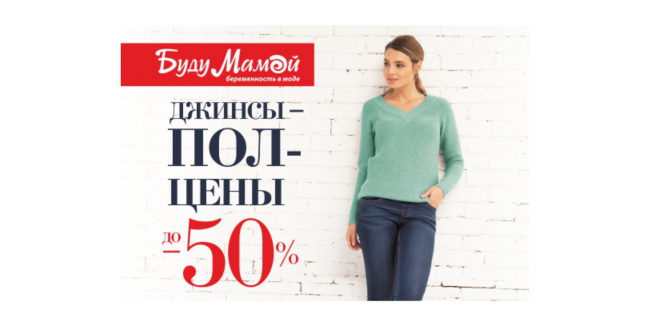 Скидки до — 50% на джинсы и джинсовые комбинезоны в магазине «Буду Мамой»