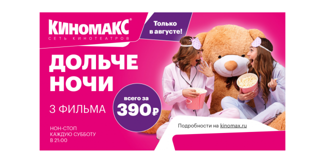 «Киномакс 3D Мегаполис» проведет субботние нон-стопы в августе  Акция «ДольчеНочи» — нон-стопы за 390 рублей — будет идти в кинотеатре «Киномакс» еще три субботы подряд: 11-го, 18-го и 25-го августа. Во время нон-стопов кинобар предложит зрителям два напитка по цене одного.  В режиме нон-стоп гостям покажут три фильма, в том числе блокбастер или картину —…