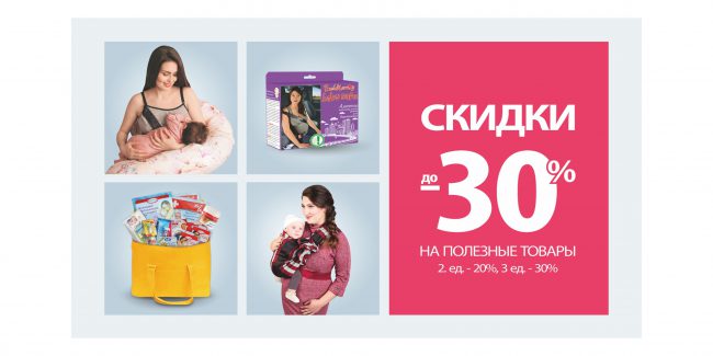 Скидка до 30% предоставляется на полезные товары: — сумки и набор для роддома; — подушки для будущих и кормящих мам; — адаптер для автомобильного ремня безопасности; — слинг на кольцах; — наборы для новорожденных. Условия акции: При покупке двух любых единиц товаров, участвующих в акции, скидка 20% на каждый товар. При покупке трех и более любых единиц товаров, участвующих в акции, скидка 30% на каждый товар. Выгодное…