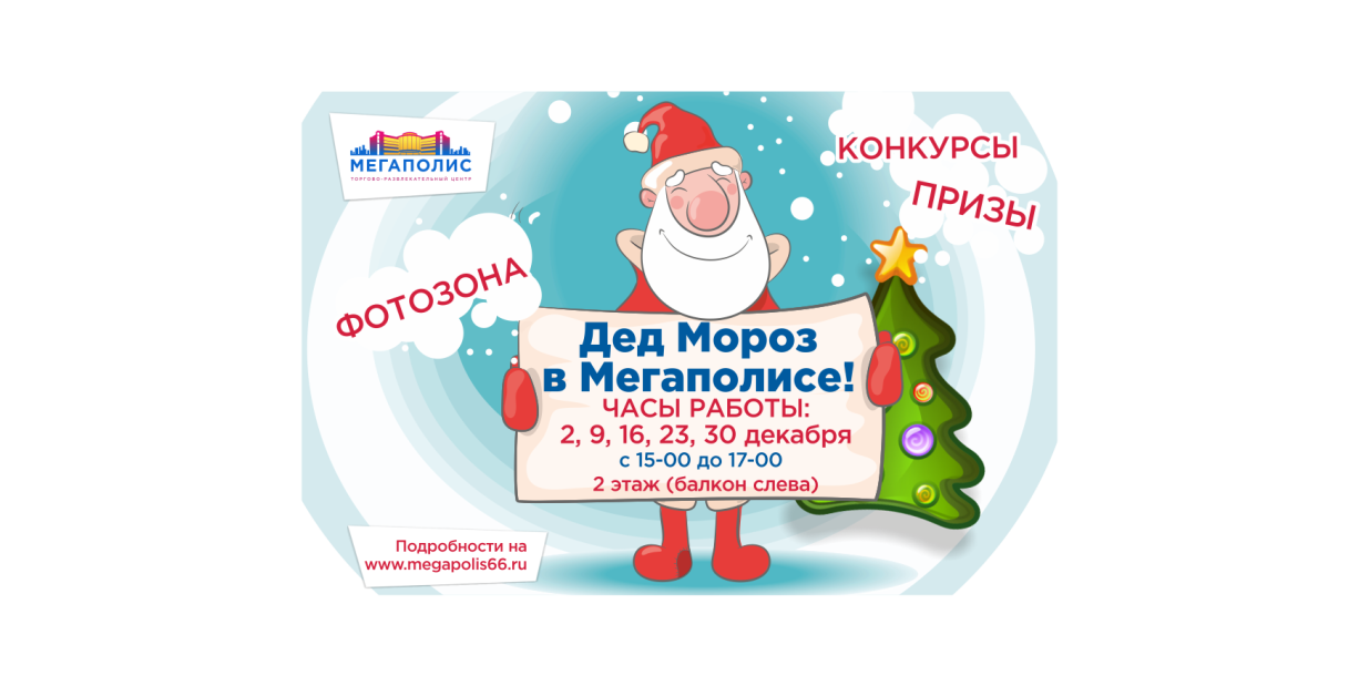Каждое воскресенье с 15-00 до 17-00 на балконе 2 этажа посетители ТРЦ Мегаполис смогут пообщаться с Дедом Морозом, сфотографироваться и получить подарки. Новогоднюю атмосферу поддержит музыка и конкурсы, подарки и сюрпризы.